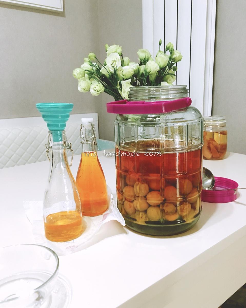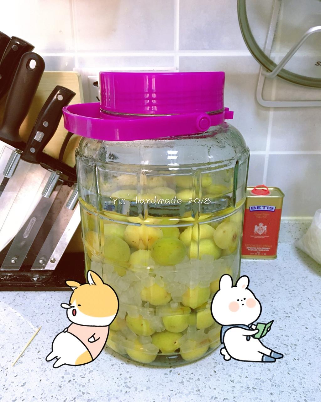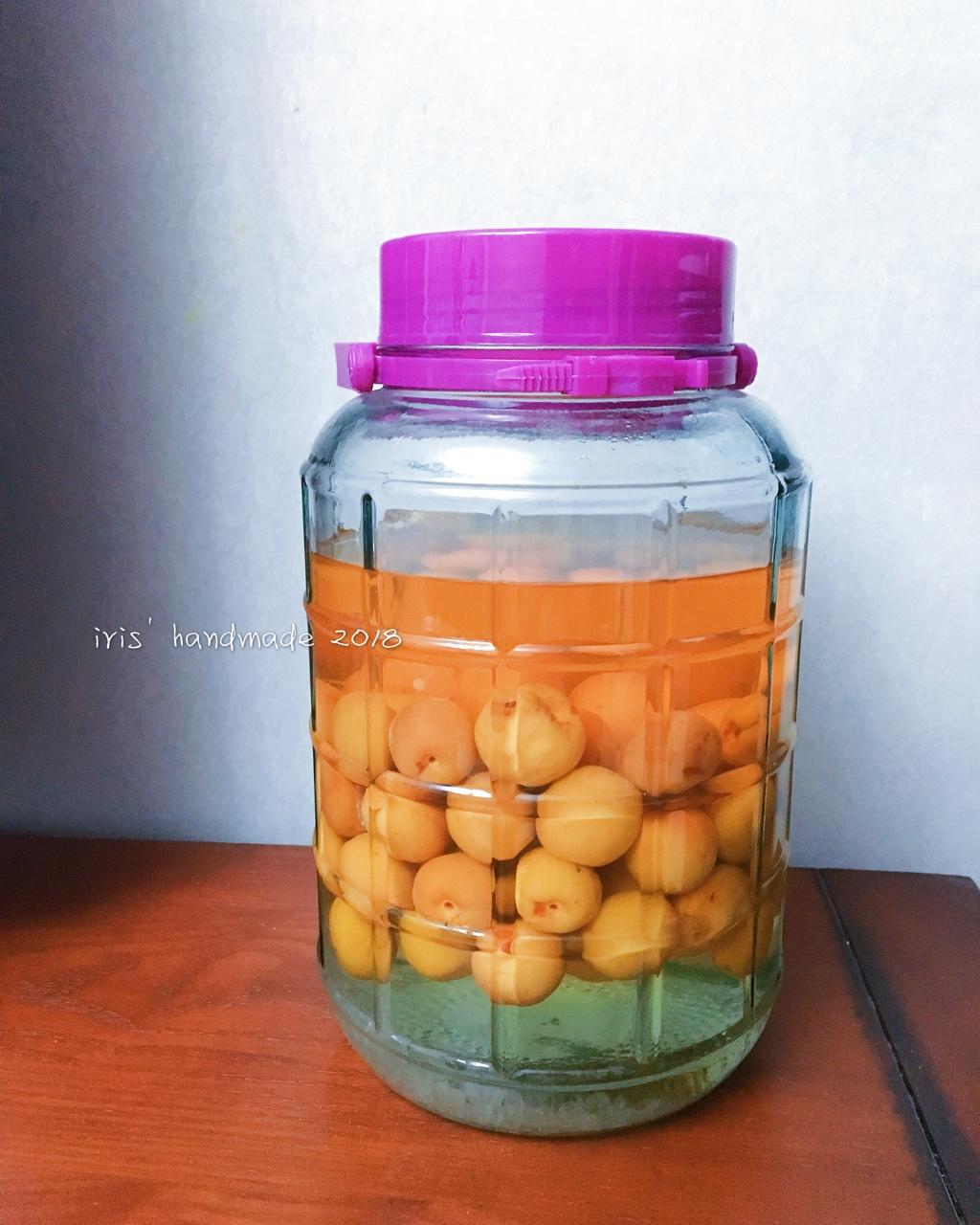 青梅酒里的冰糖还没完全融化 以梅子们为界限 酒体已经出现了分层 上半部分变成了黄色 下半部...