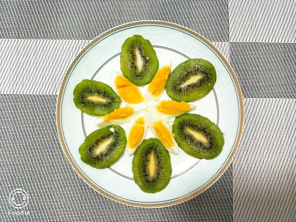 💝鸡蛋煮熟切成条状,与猕猴桃片一起摆盘,色彩是不是看起来很棒了,外加一碗枸杞稀饭...