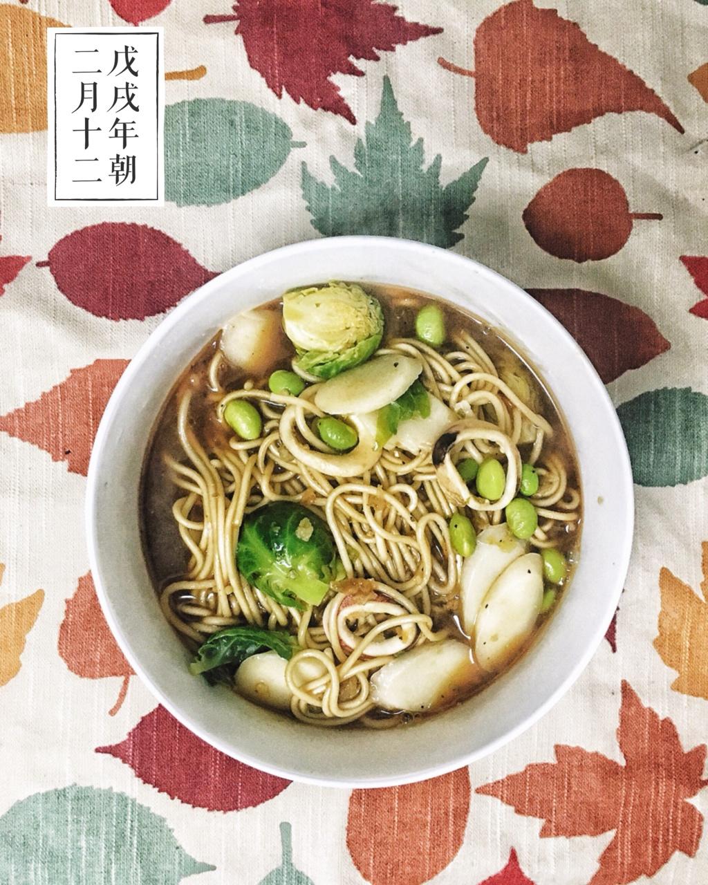 黑胡椒捞面:兰州拉面🍜,年糕,毛豆,孢子甘蓝,鱿鱼🦑,黑胡椒料粉