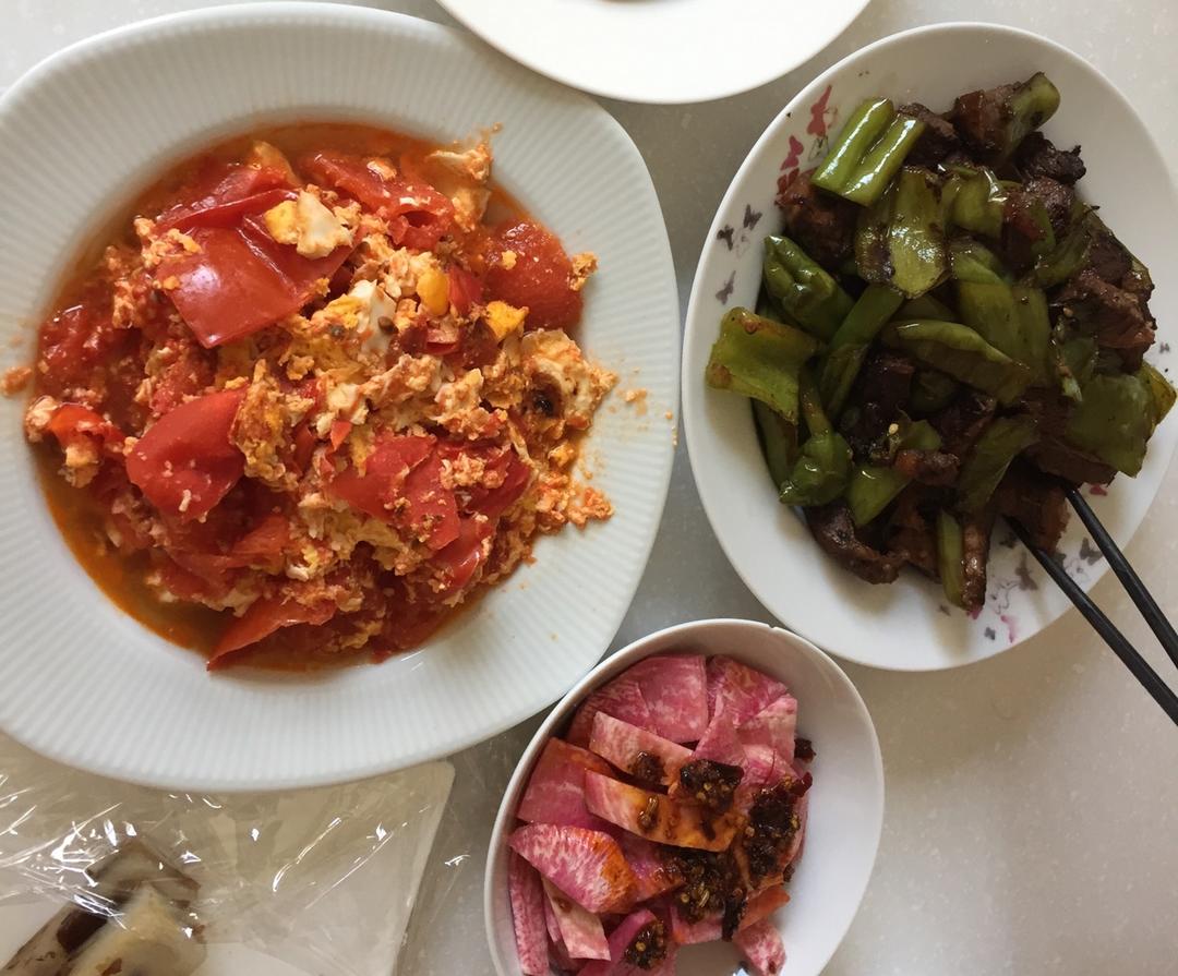 尖椒牛排肉,番茄鸡蛋,香辣心里美,刀削面