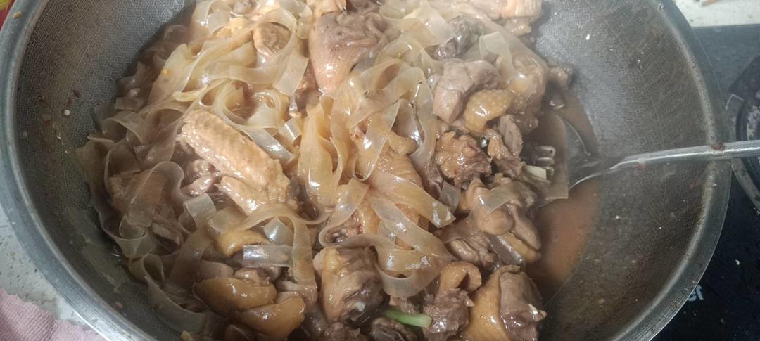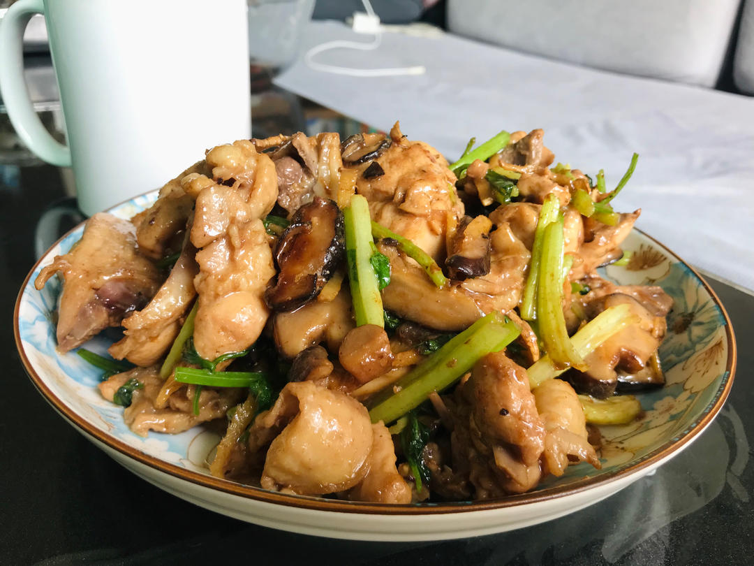 姜丝,香菇爆香,放入鸡肉翻炒,加蚝油盐几粒冰糖炒至金黄,加八角桂皮水和少许辣椒焖,焖到...