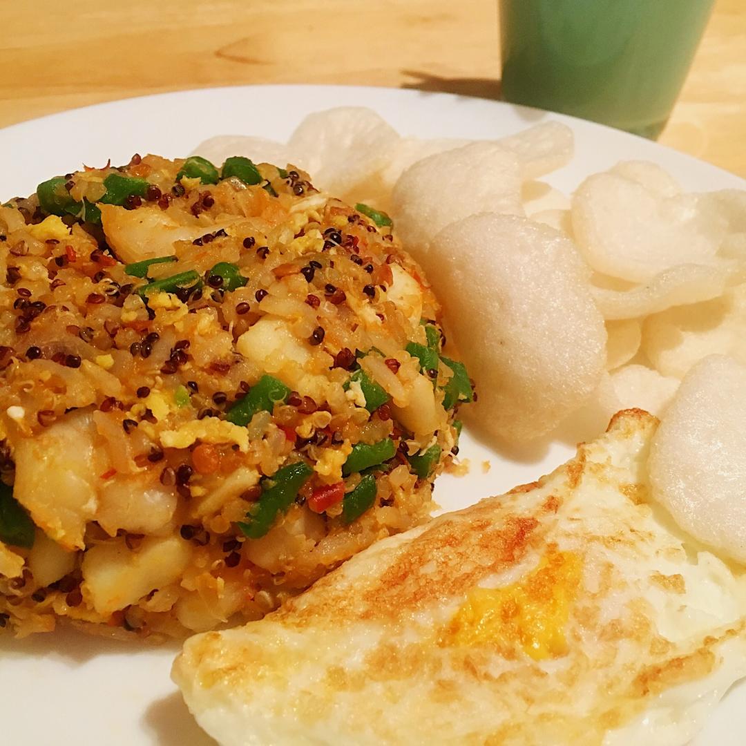冰箱里还有半瓶okky带来的sambal~稍微健康一点的版本 用了藜麦😂😂没有煎成太阳蛋😂