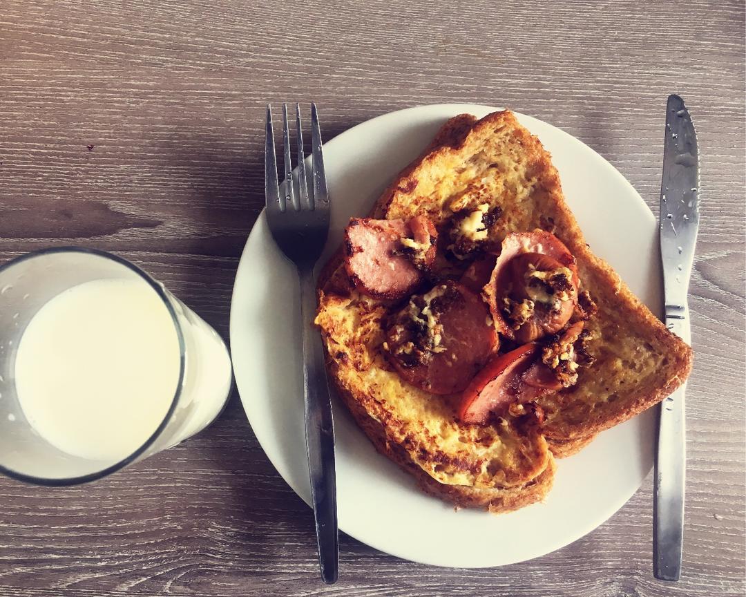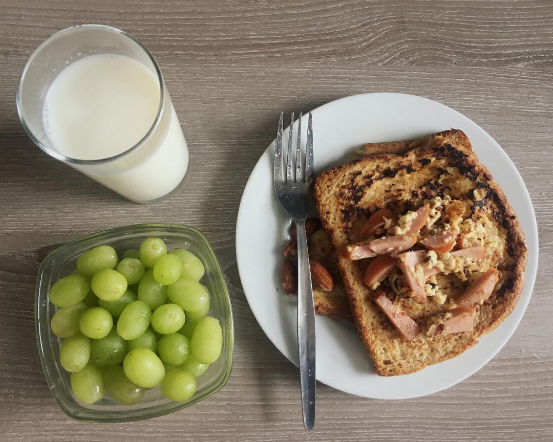 比昨天做的好吃!没有用很多油,一点点黄油就可以煎了,没有厚吐司,两片全麦吐司叠在一起煎,就不会全部沾满蛋液煎出来软趴趴了...