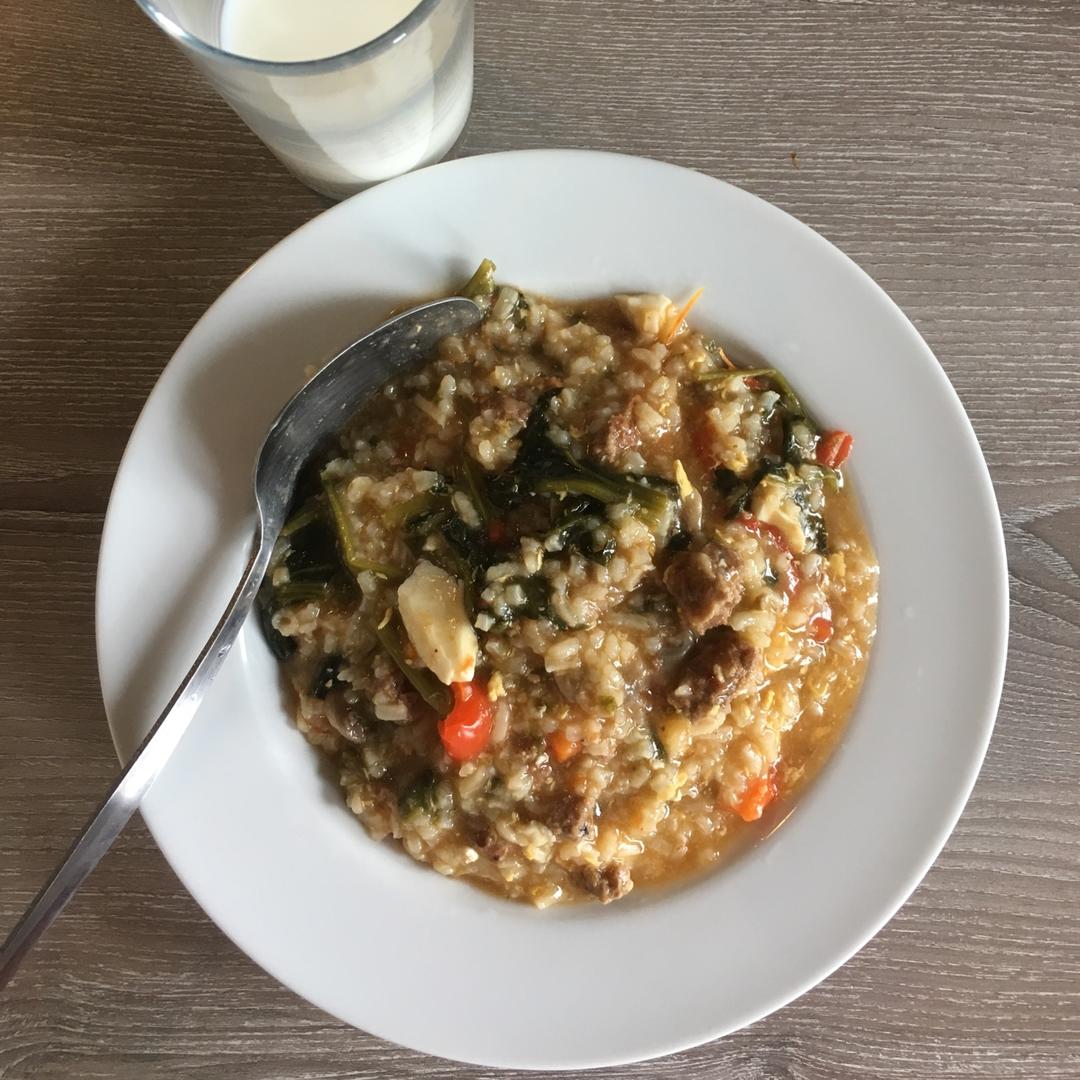 牛肉菠菜蘑菇鸡蛋粥~算是汉堡牛肉饼的后续,还剩下一颗牛肉饼捣碎煮粥,啥佐料都不用加,牛肉饼够味了。加入菠菜,蘑菇,西红柿...