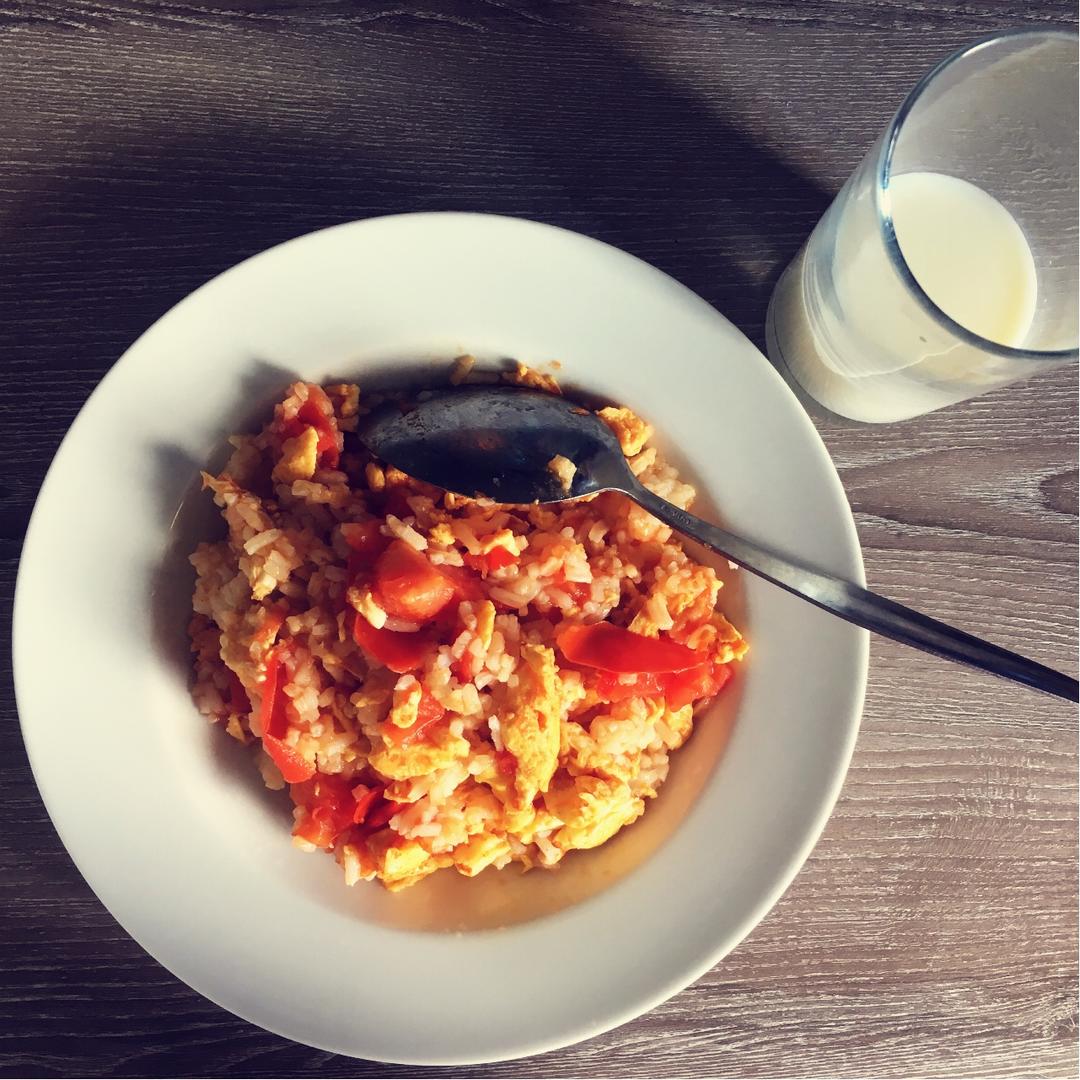 西红柿炒鸡蛋,饭太湿了,放进去一起炒刚好。应该放咸一点的,毕竟我不是爱吃甜的人呐~但还不错,简单吃吃去上学喽👍 #午餐•...