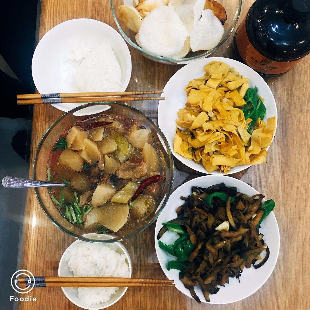 牛腩炖萝卜,干豆腐炒尖椒,素炒茄丝,炸虾...