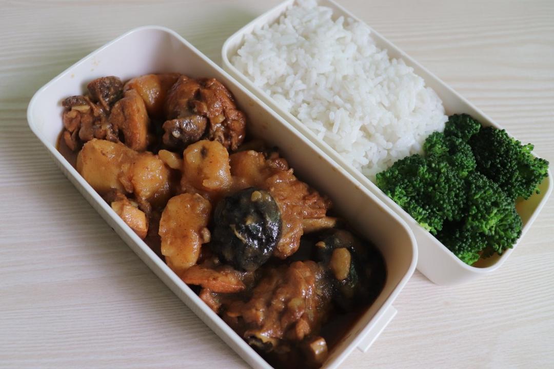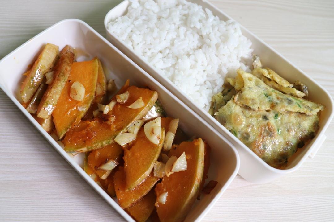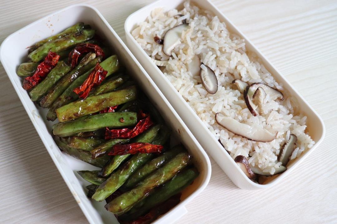 今天是素食便当~「干煸四季豆+香菇饭」香菇切片加一小块黄油米饭上一起煮,比吃单调的白米饭更...