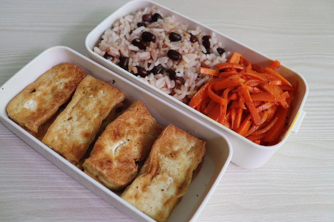 「红豆饭+煎豆腐+素炒萝卜丝」今天是全素便当😋豆腐煎好撒点盐,胡椒和孜然,有点烧烤的味道~...