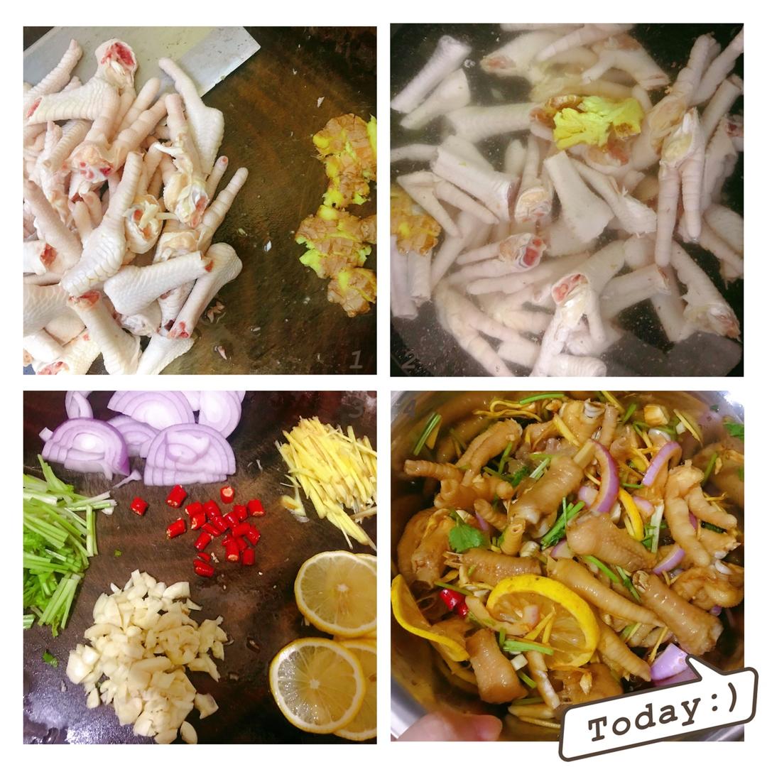 2.锅里加冷水放入鸡爪、姜片、料酒 水煮开后继续煮7-8分钟即可。 3.将小米椒切小段、...