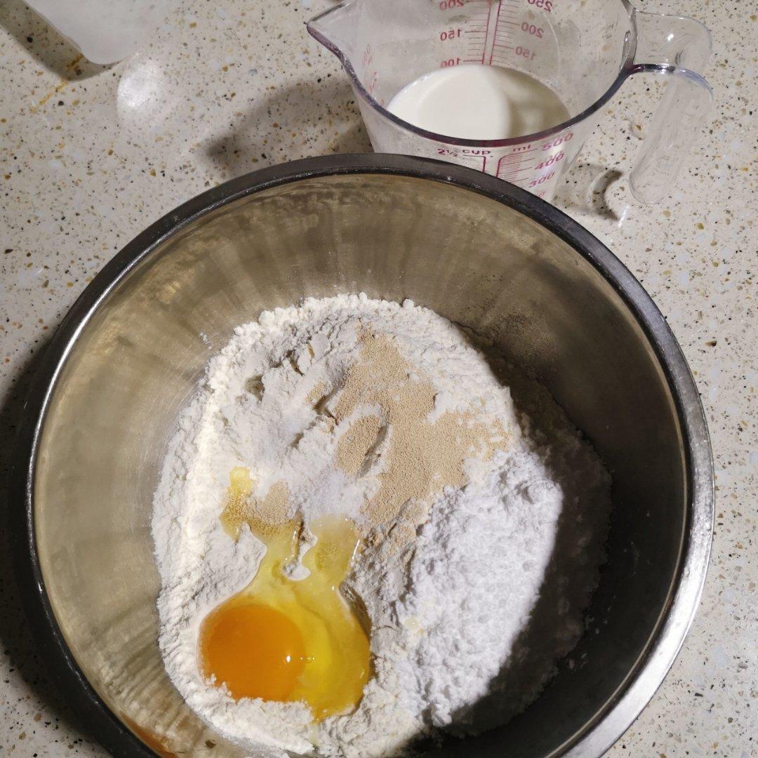牛奶改成150g,豆沙换成葡萄干和南瓜籽,直接和在面里,也也不能呢!