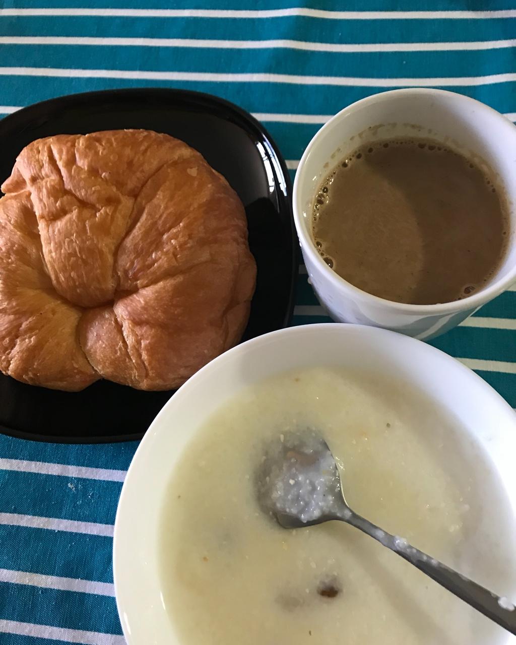 可颂面包,玉米碴子粥和咖啡,我想和麦片粥的可是却买了玉米碴子粥,我的眼神也是无敌了🤪🤪😝