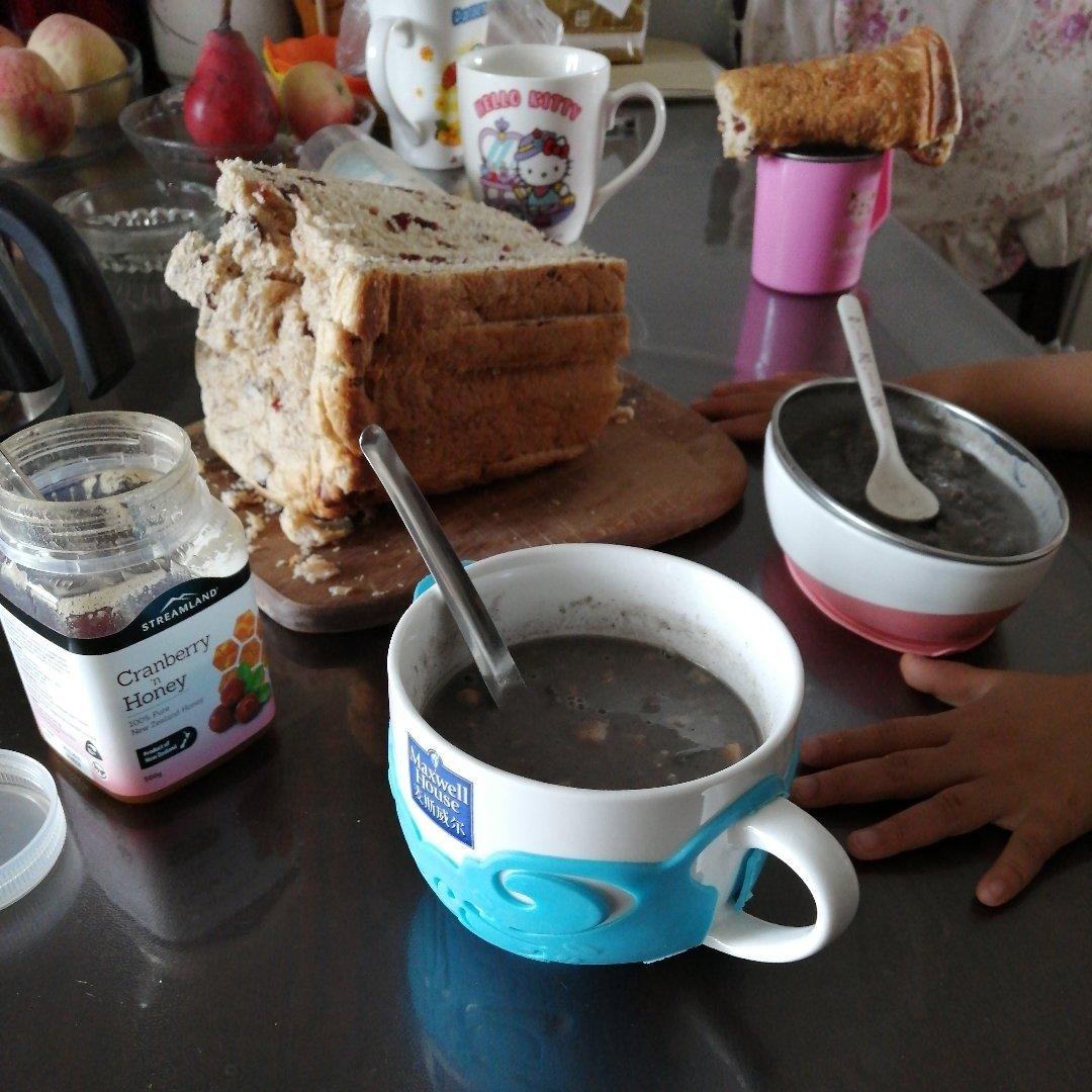 黑豆黑芝麻,红豆红枣花生核桃煮熟打成糊糊,再加入牛奶🥛变成牛奶露,相信我,好吃到流泪~饱腹又营养,大爱~#早餐•2020...