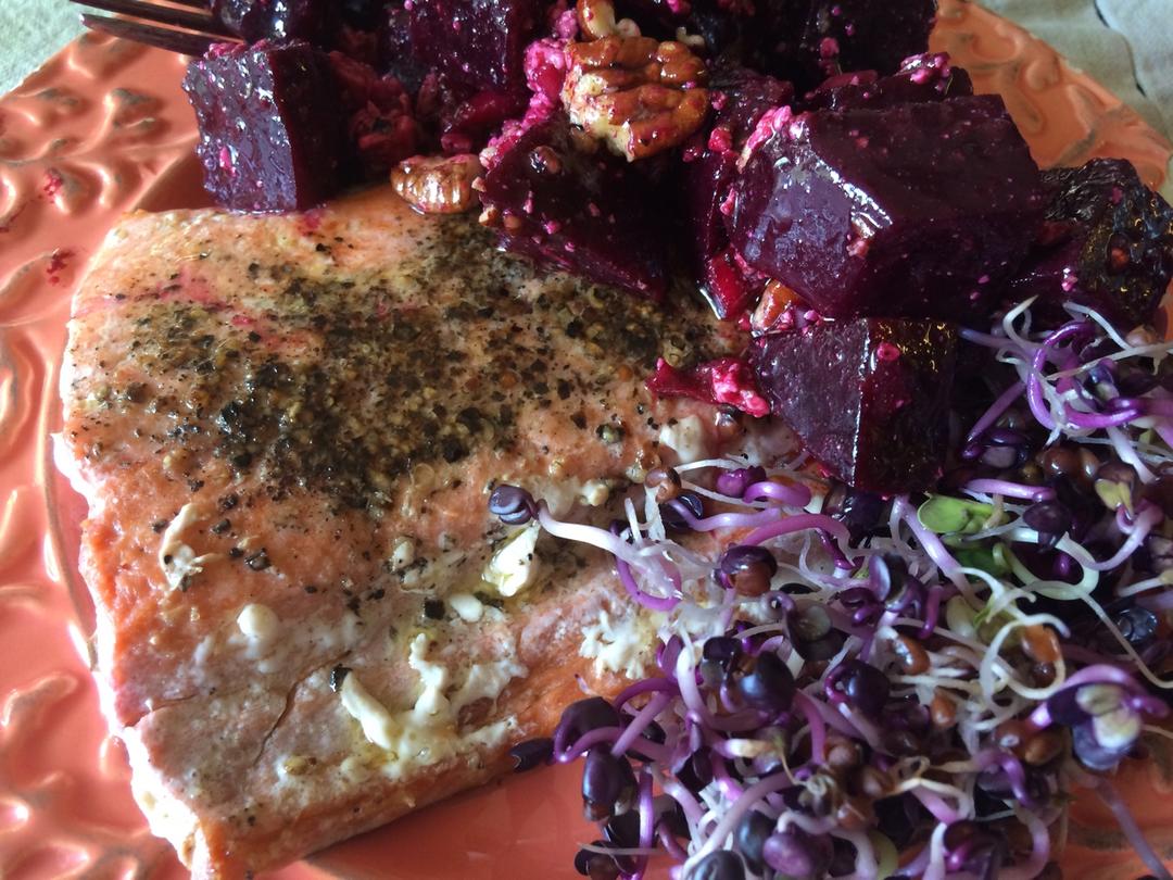 煎三文鱼、甜菜根沙拉、萝卜芽菜,鱼类沙拉类等全是🐻做,现在是三文鱼季节,costco里野生三文鱼比以前价格的一半还低 #...