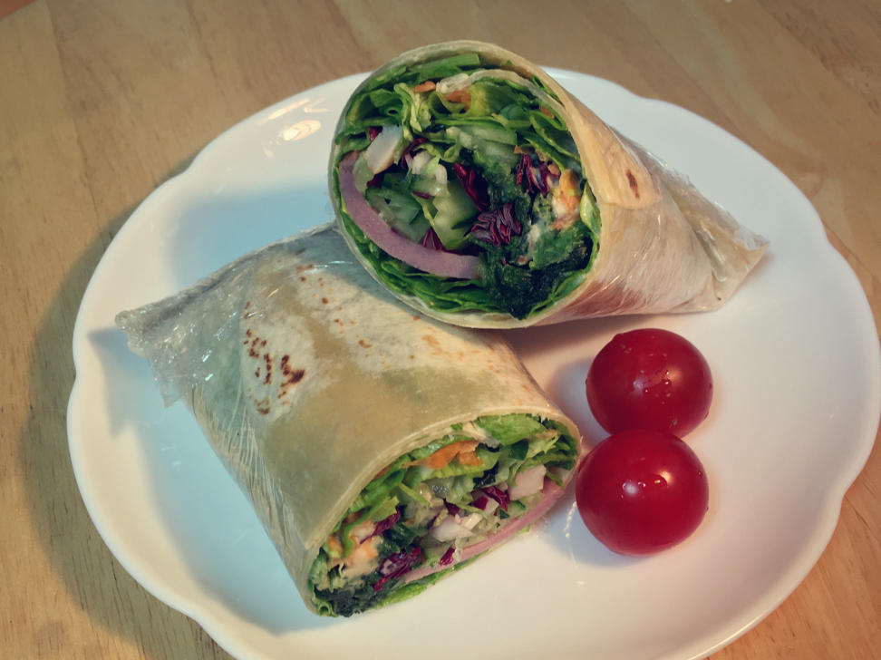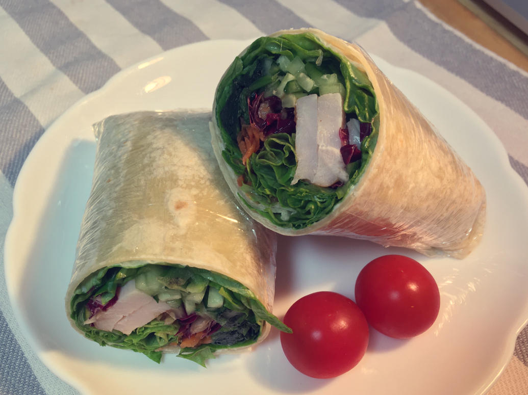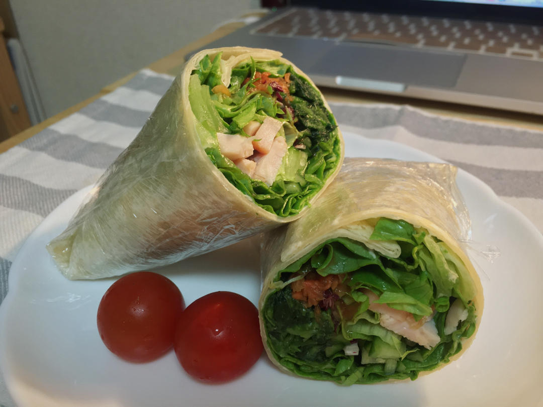【烟熏鸡胸肉蔬菜卷饼🌯️+🍅樱桃番茄&橘子🍊】(前七)
