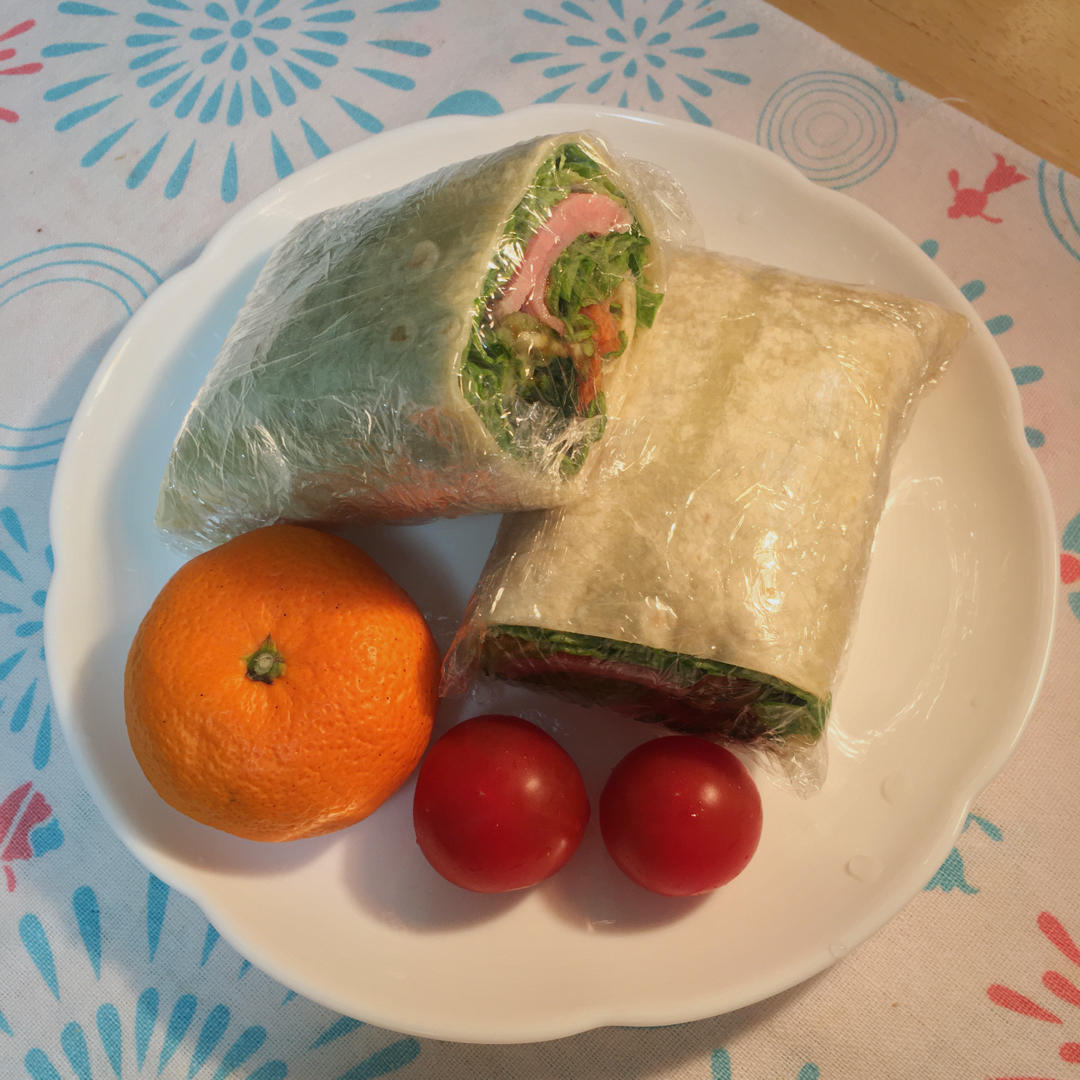 【猪肩里脊火腿蔬菜卷饼🌯️+🍅樱桃番茄&橘子🍊】(前六)