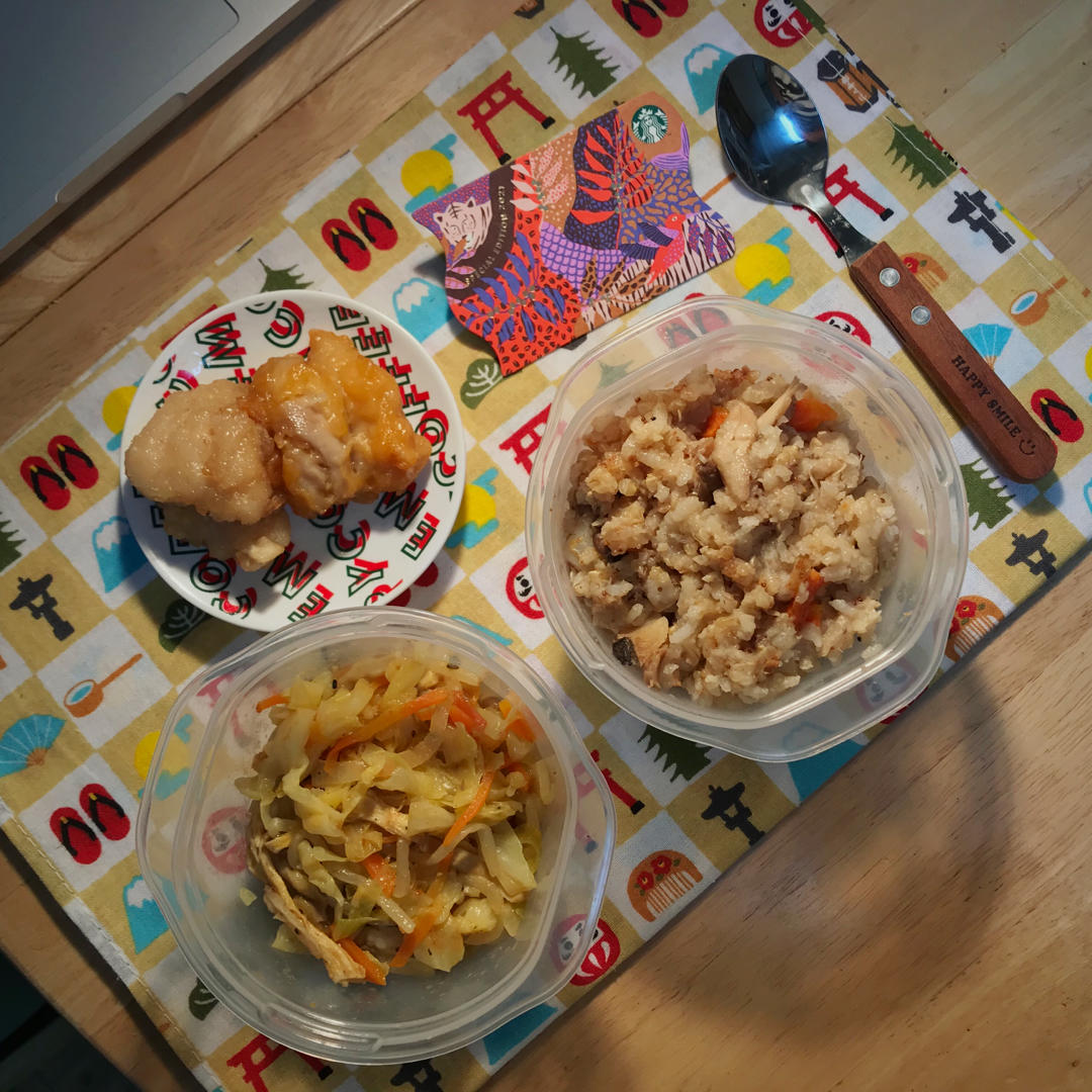 【秋鮭蘑菇炊飯+印度风味番茄炒卷心菜+微波炸鸡🍗】(123)