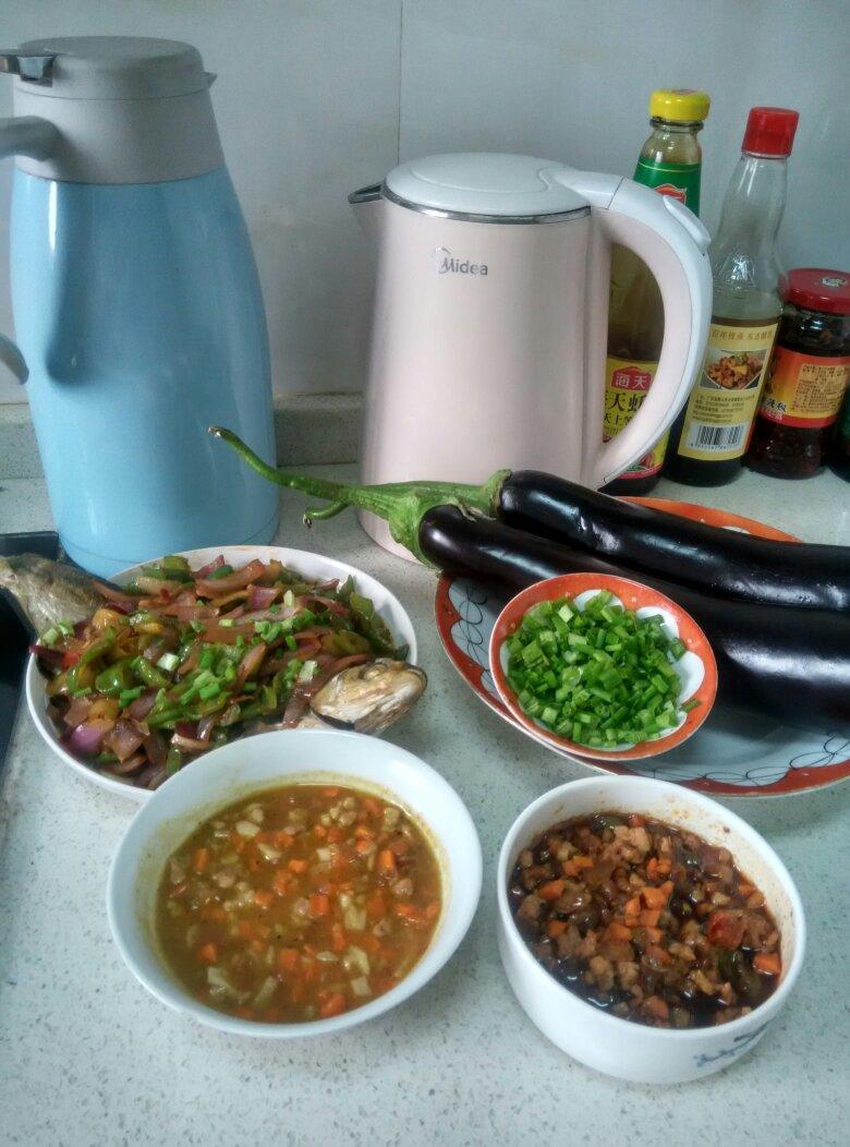 今天午餐:红烧鳊鱼+烤茄子。(已制作好烤茄子汁→材料:肉沫+胡萝...