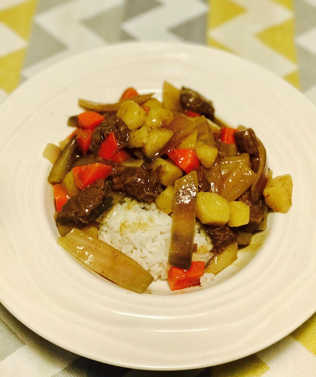 咖喱牛肉,日本很多咖喱都试过,还是偏爱国产的百梦多,先放胡萝卜土豆,再放肉,再放洋葱,最后熟度就差不多 #午餐•2018...