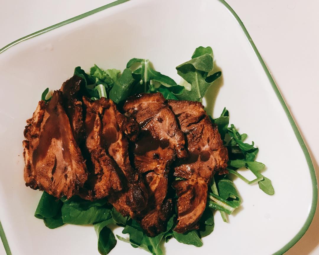 打包回的酱牛肉配沙拉菜和一根香蕉,饭后一小块斑斓海绵蛋糕