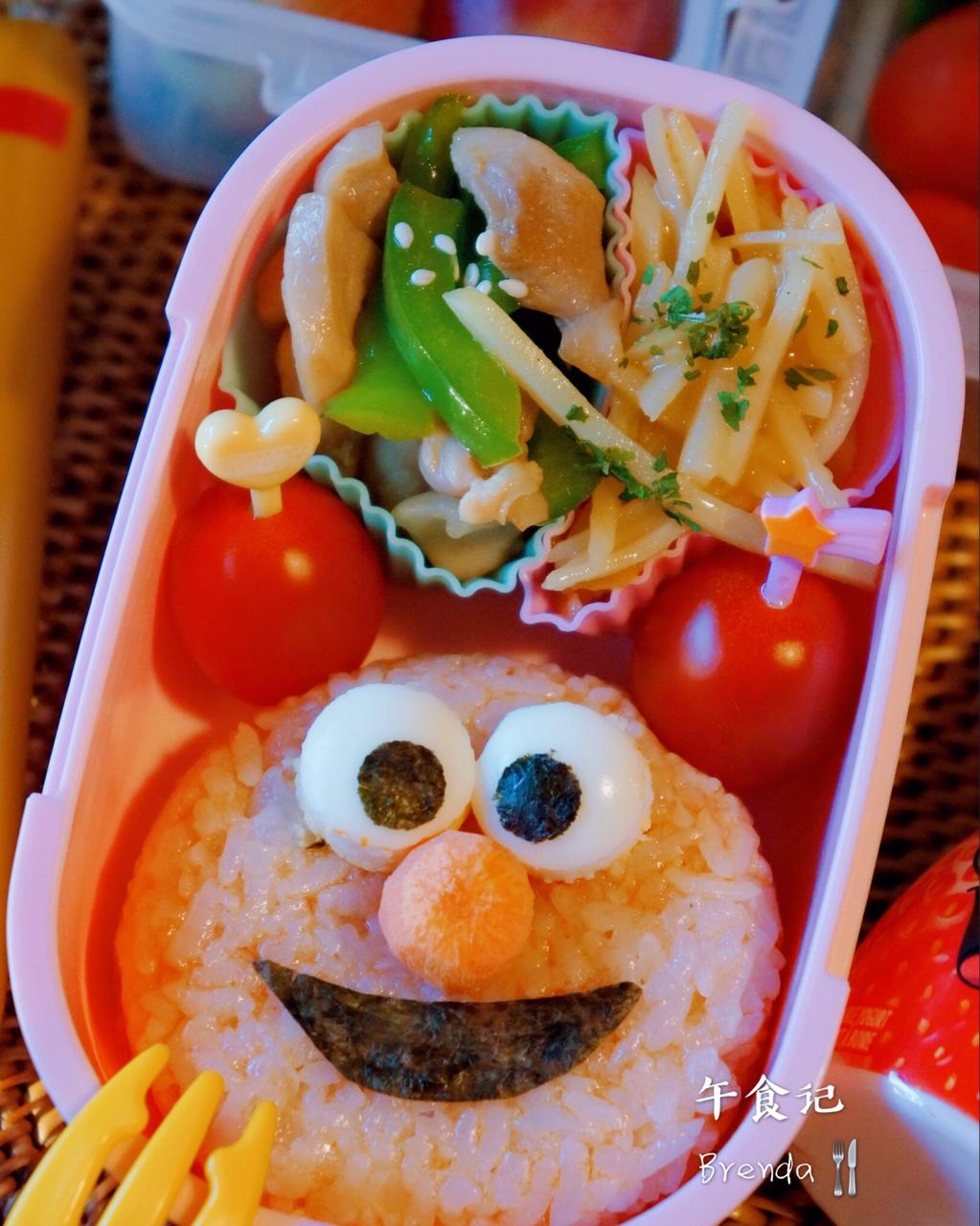 早安Wednesday☀️☀️~Elmo饭团/青椒炒鸡腿肉/咖喱土豆丝/葡萄/🥒/🍅/鱼肠。 #午餐•2018年5月3...