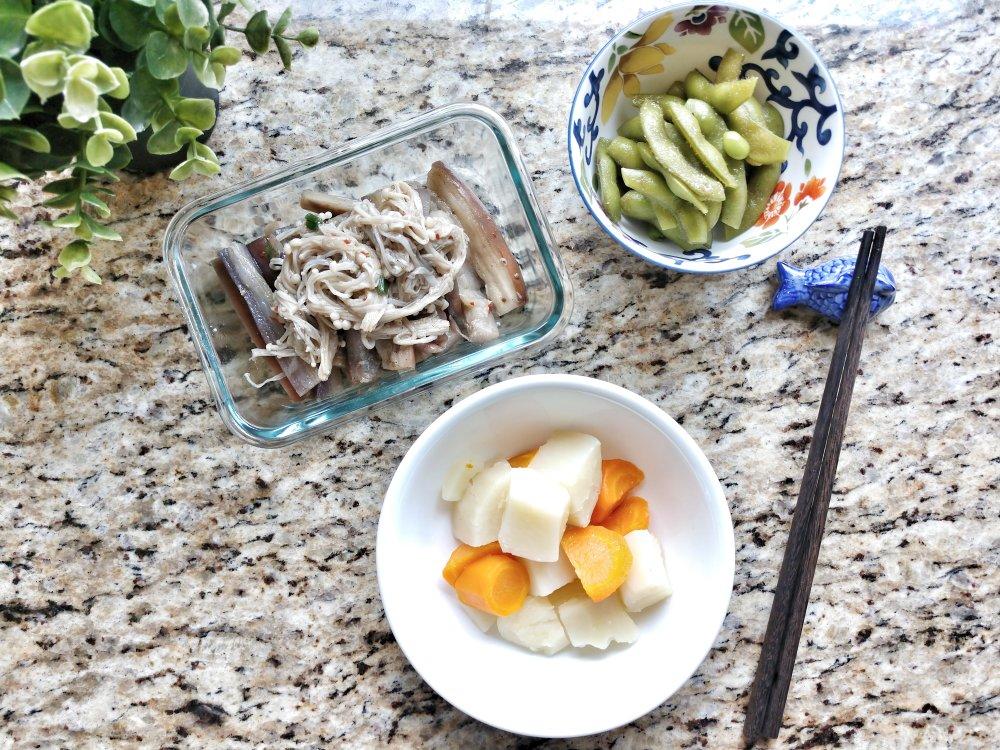 凉拌茄子金针菇,醪糟毛豆,水煮土豆和胡萝卜(其实是排骨汤煮的)