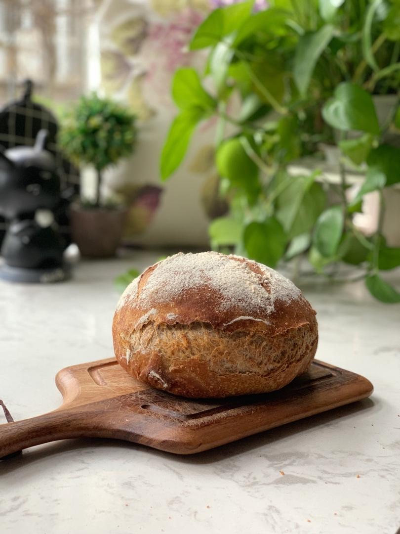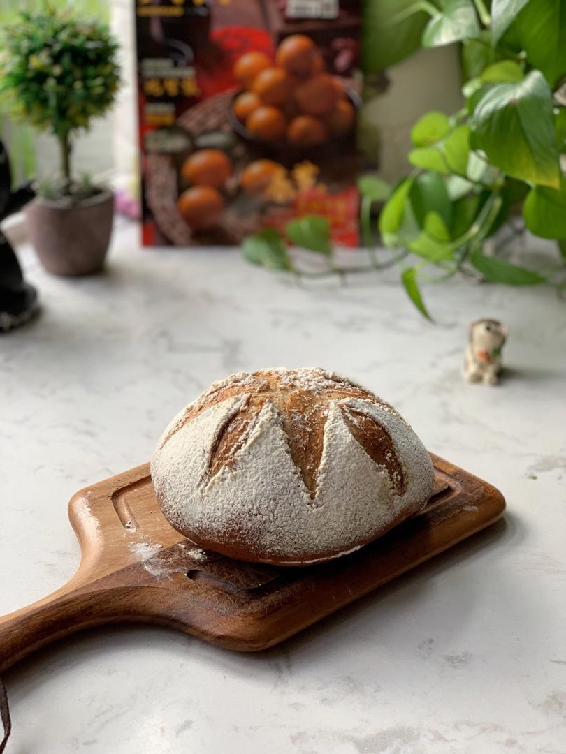 100克酵种、250克高筋粉、150克全麦粉、260克水、5克盐,水解、折叠、整形、冷藏发酵、回温、250度蒸汽烤8分钟...