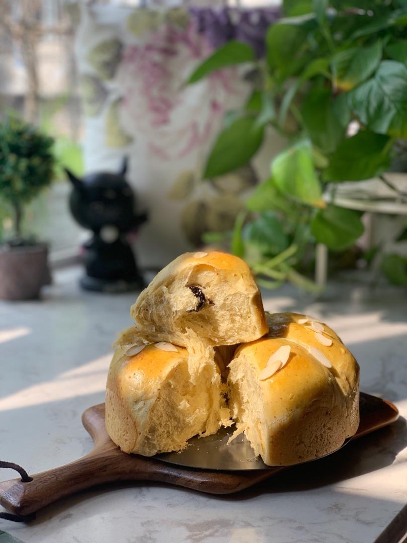 第一次喂养剩余的酵种,加了新良多谷面包粉、鸡蛋、黄油、奶粉、盐、清水,减量的干酵母和面,里面卷了葡萄干,入160度烤箱烤...