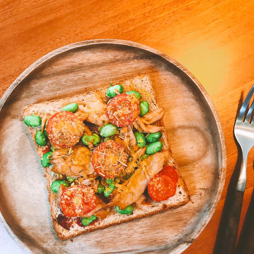 吐司+番茄泥+毛豆+油浸金枪鱼+小番茄+ nutritional yeast + rosemary +...