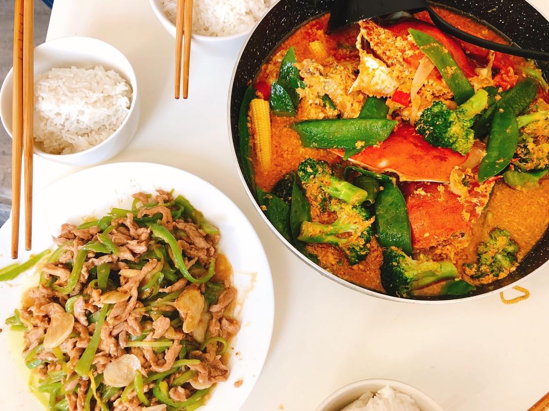 泰式咖喱蟹和青椒肉丝,青椒肉丝炒得时候加点甜面酱味道更好噢!