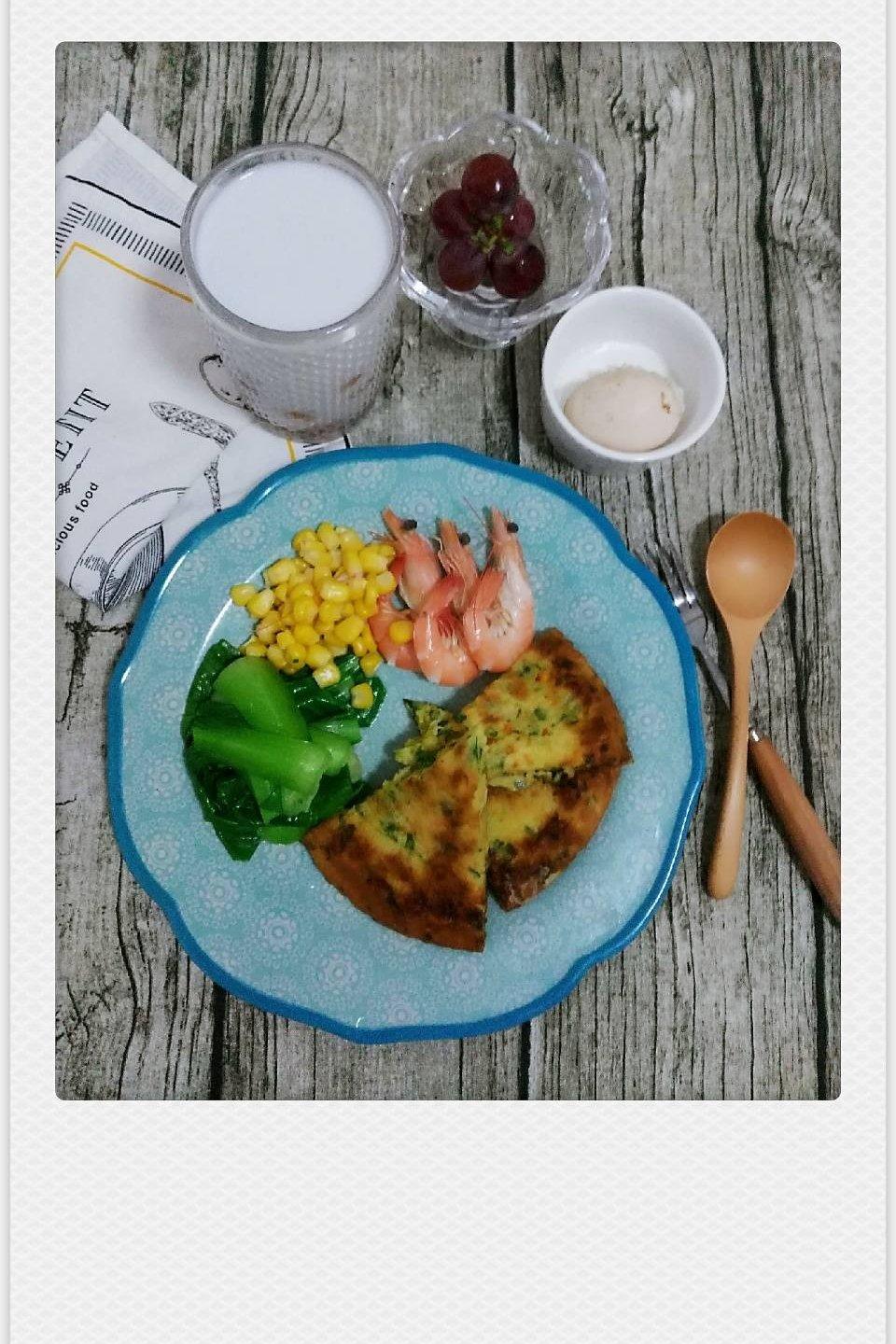 椰汁芋圆+蔬菜虾米鸡蛋煎饼+青菜+玉米粒+海虾+鸡蛋,...
