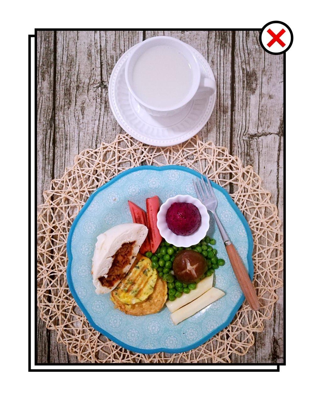 早上好( ^_^)/,豆浆+肉包+蛋饼+香菇+青豆+火腿+火龙果,降温...