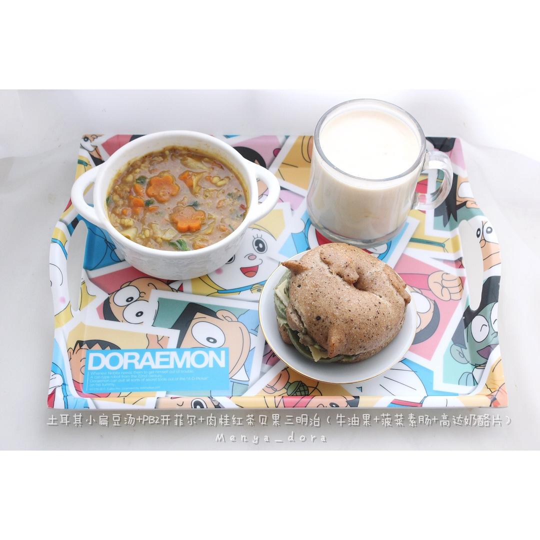 💭肉桂红茶贝果+菠菜素肠+牛油果泥+芝士片!🤤...