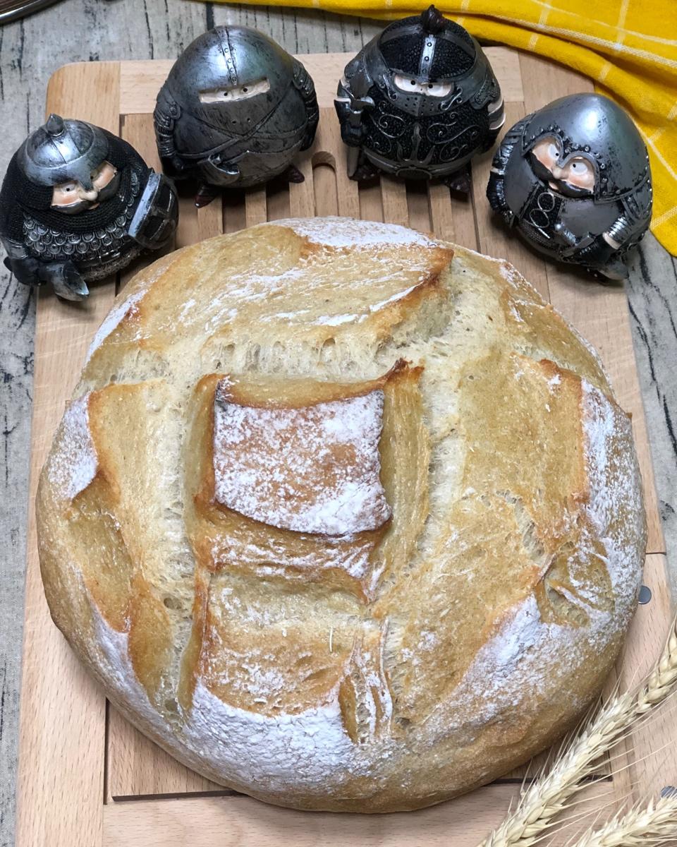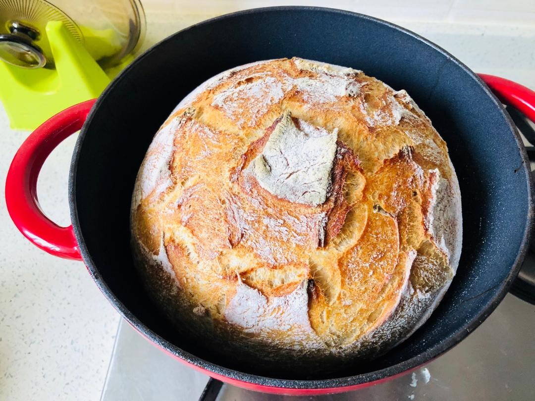 用的900克加全麦粉的配方,用了24cm的铸铁锅,非空调房一小时发酵已足够,烤箱加铸铁锅预热20分钟,这个方子和之前做过...
