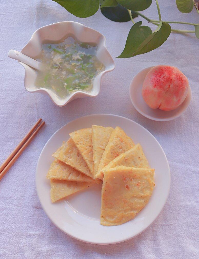 土豆丝饼、丝瓜蛋汤、水蜜桃
