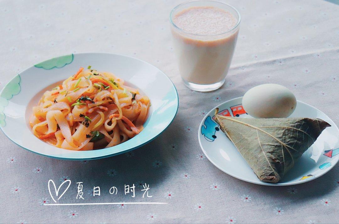 炒河粉、鲜玉米粑粑~鸭蛋、麦片牛奶