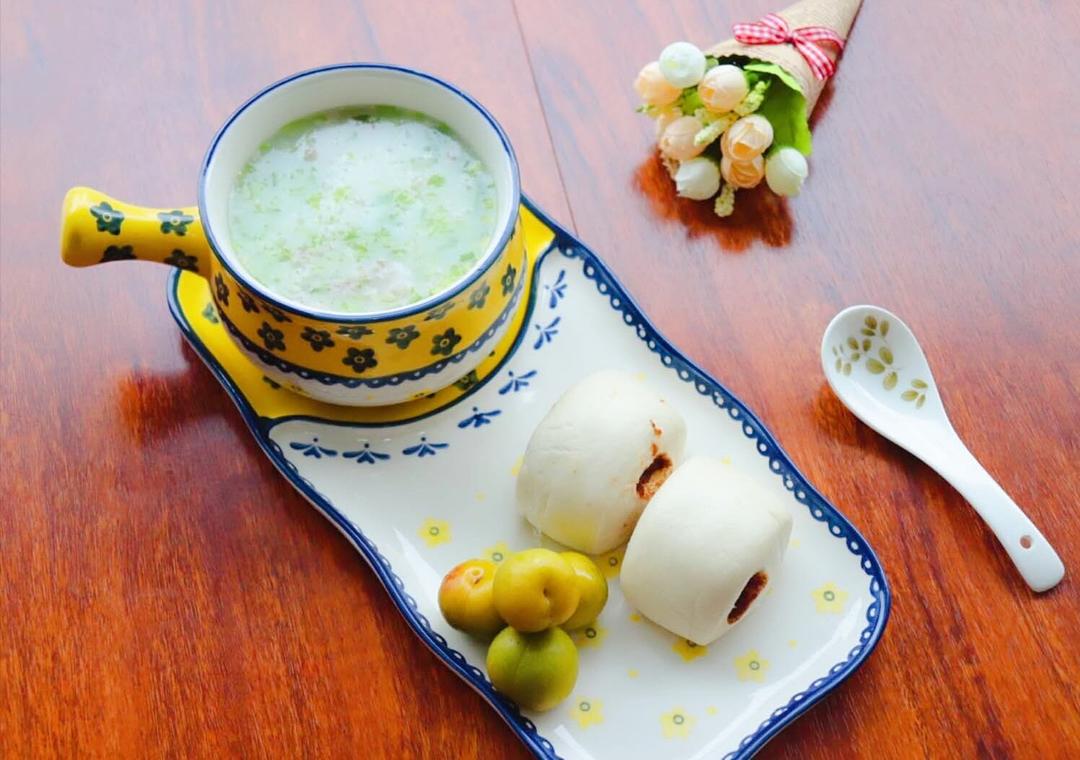 豆沙小馒头、青菜肉末粥、李子