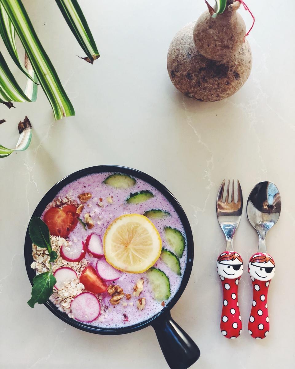 紫甘蓝苹果无糖酸奶思慕雪➕燕麦➕坚果🌰铺上黄瓜番茄水萝卜柠檬🍋
