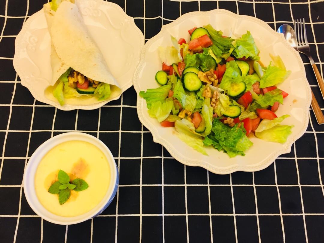 蒸蛋羹+核桃蔬菜沙拉🥗卷饼