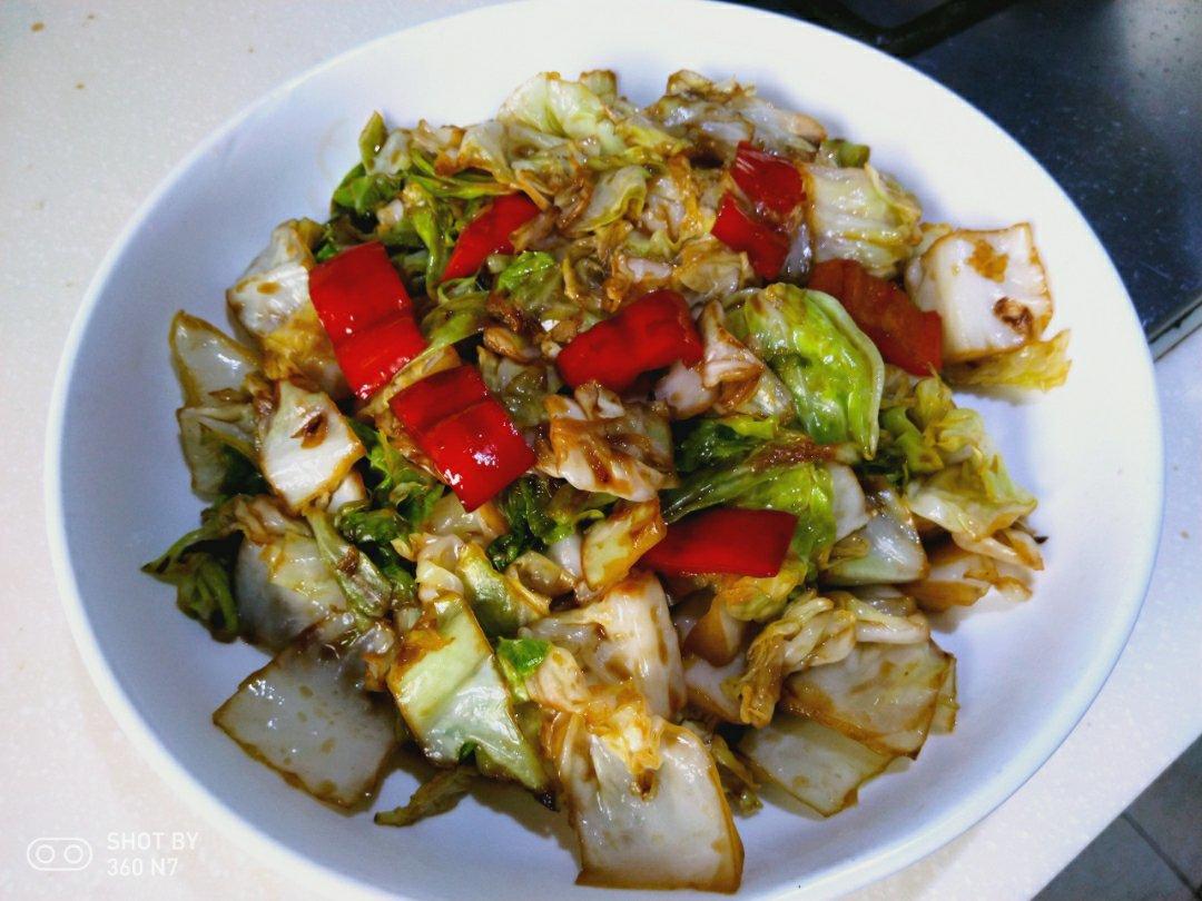 热锅后倒一点油,甘蓝撕巴撕巴,油热放甘蓝,慢慢不停的翻,不然容易糊。