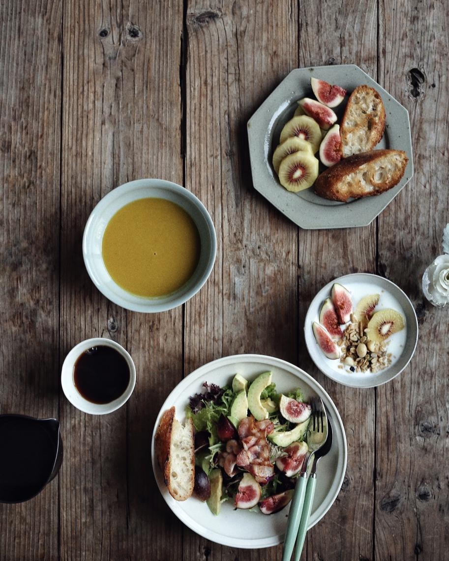 南瓜味增浓汤,法棍,无花果牛油果沙拉,咖啡☕️