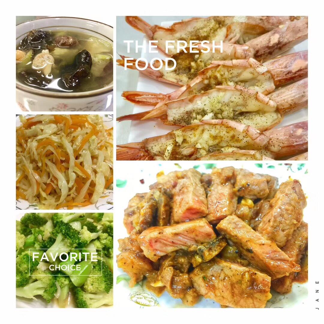 烤红虾,胡萝卜炒卷心菜,蒜蓉西兰花,黑椒牛排(为了娃能快吃,要切开),味增汤。胃已超负荷,让我动一动😂 #晚餐•2...