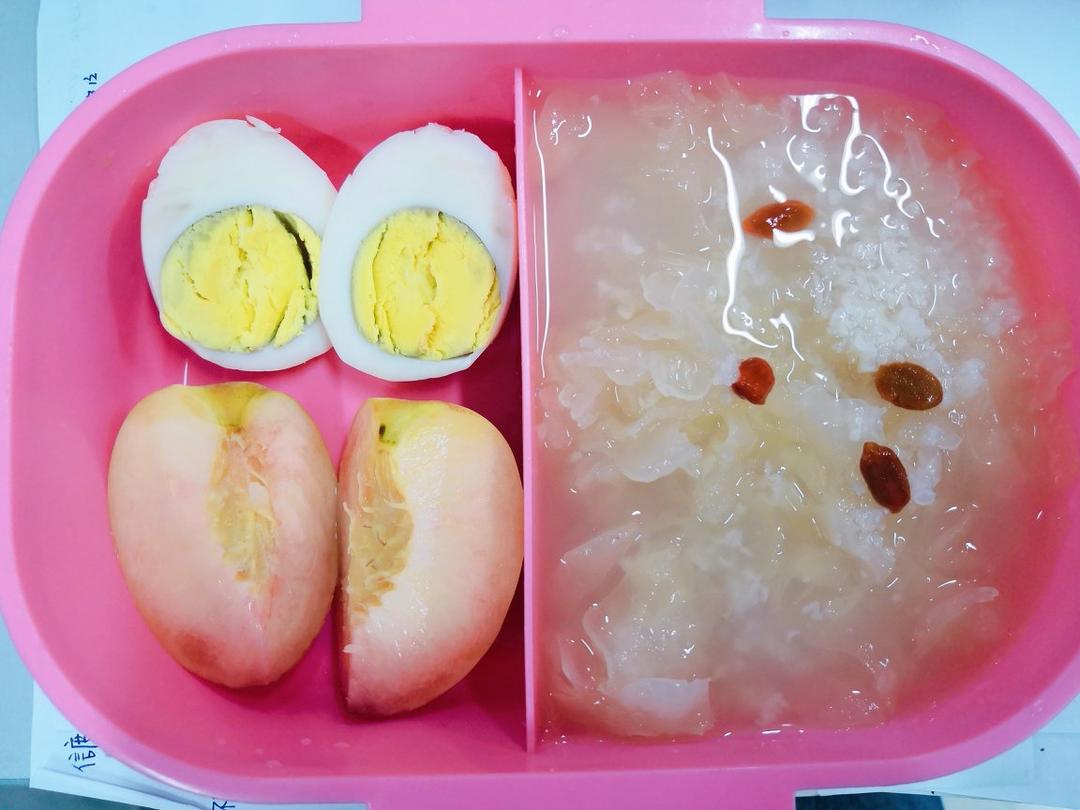 D3:焖烧杯枸杞银耳糯米粥+鸡蛋+半个桃子🍑