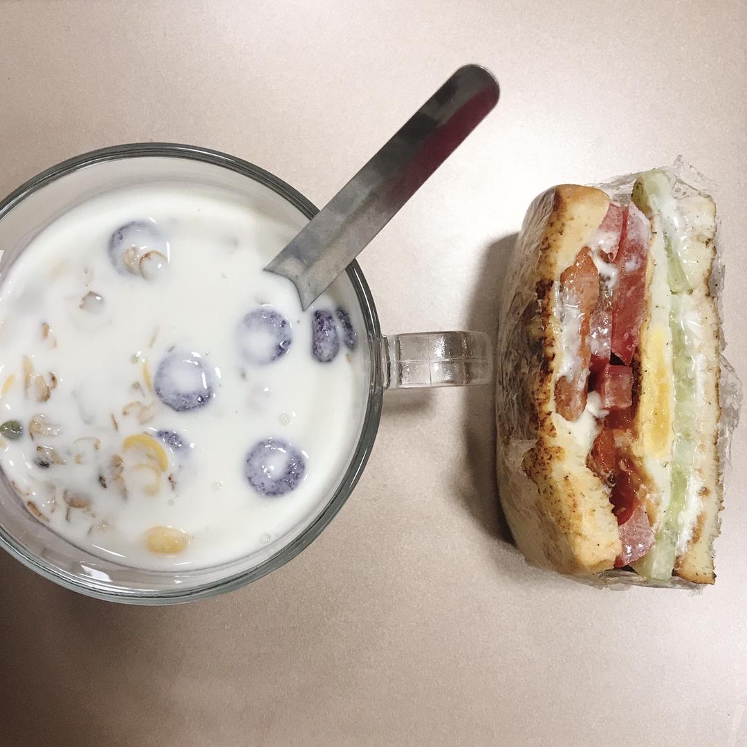 早呀!今天妹妹不用上课,然后刚好昨天燕麦刚到,所以燕麦酸奶+三明治当早...