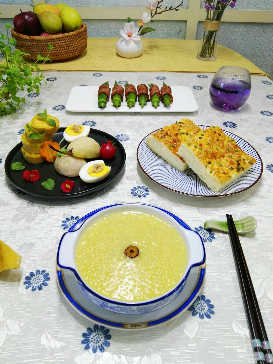 小米粥、红薯 水煮蛋 蜂蜜烤梨拼盘、培根卷秋葵