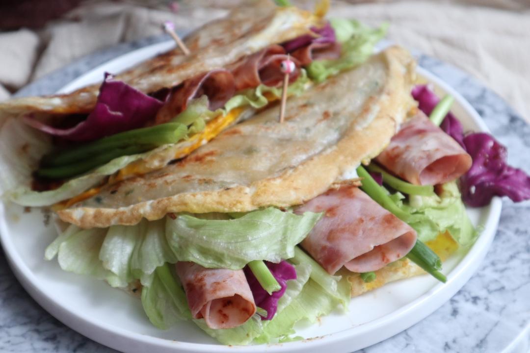 食材:手抓饼 生菜 紫甘蓝 小香葱 鸡蛋 美式火腿 泰式辣椒酱丘比特沙拉酱