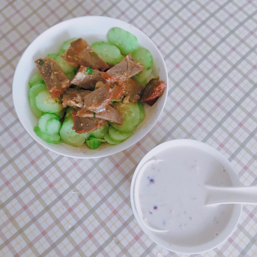 黄瓜牛肉 牛奶红豆小米燕麦米薏仁粥