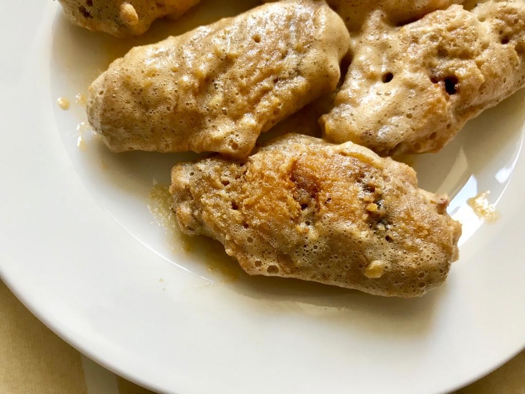蛋黄鸡翅:鸡翅腌好炸好捞出来。留底油,蛋黄炒冒泡(蛋黄:鸡翅1:4),鸡翅倒进去裹匀蛋黄。