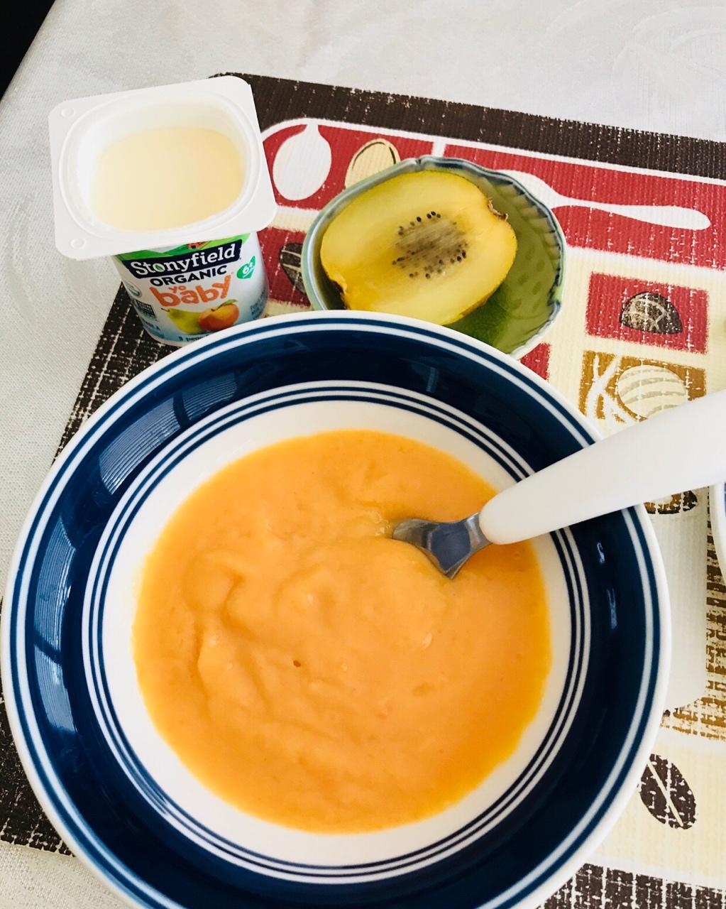 弟弟的辅食,山药胡萝卜土豆牛肉汤糊糊,小酸奶半杯,🥝几口,剩下的我来消灭😏