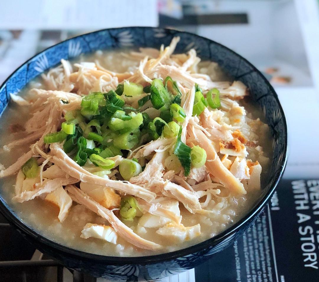 鸡丝咸鸭蛋粥~再配个小腌菜,周末早餐轻松搞定!