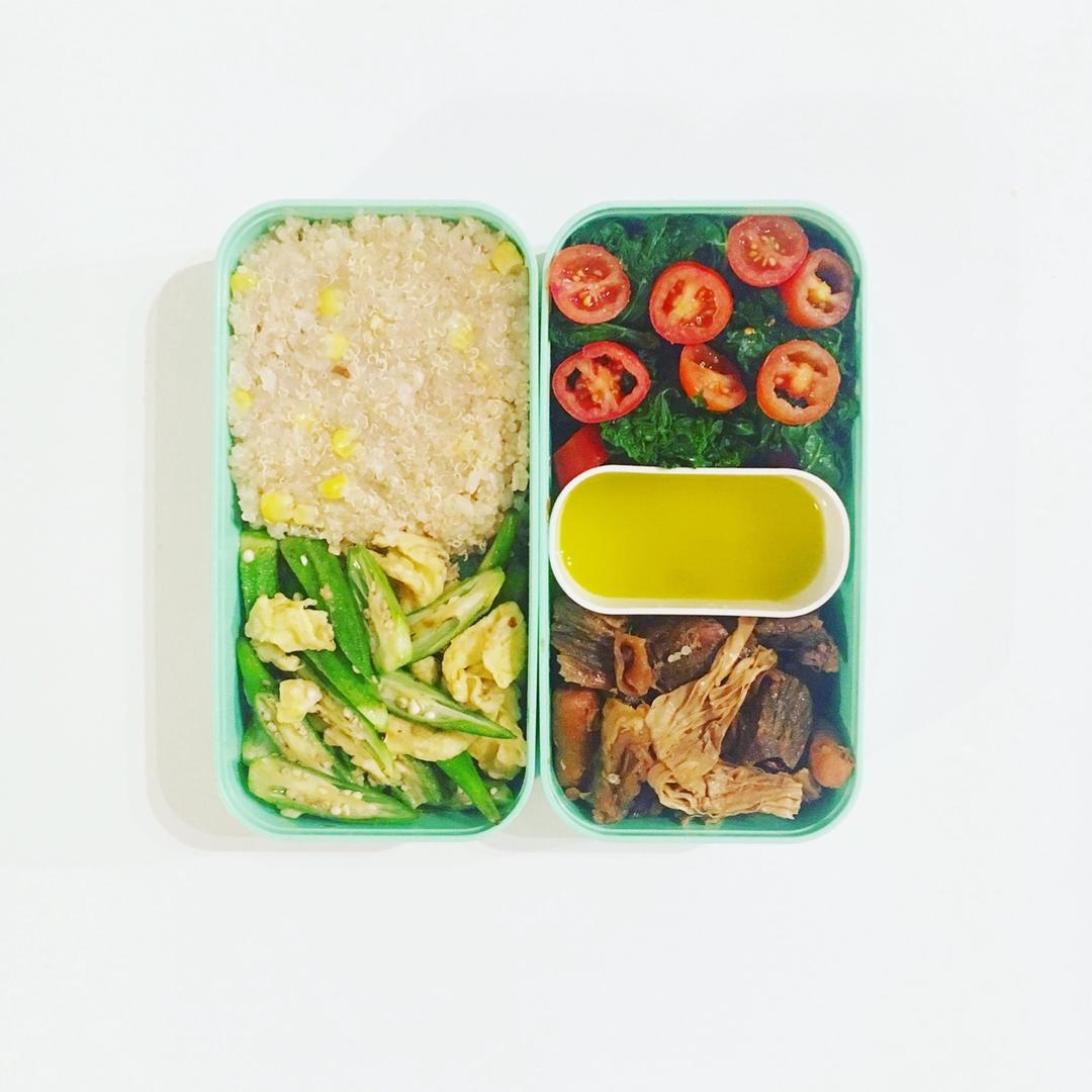 小番茄拌羽衣甘蓝+腐竹红烧牛腩+秋葵炒蛋+糙米蒸藜麦